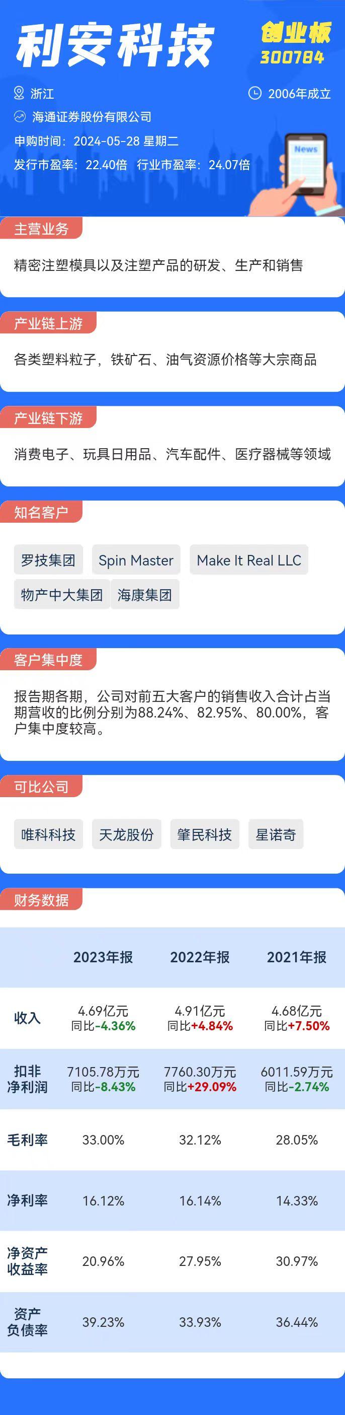 从估值看,公司发行市盈率和行业平均值基本持平,考虑近期新股上市首日表现较好,因此首日破发风险一般。不过,公司近年来业绩增速处于低位十倍杠杆,2023年有所下滑,综合判断利安科技首日破发概率约10%。